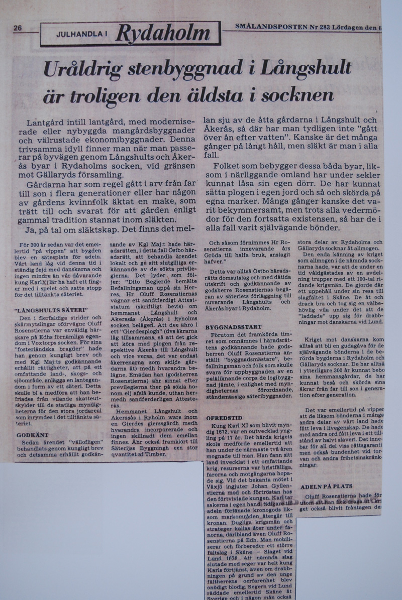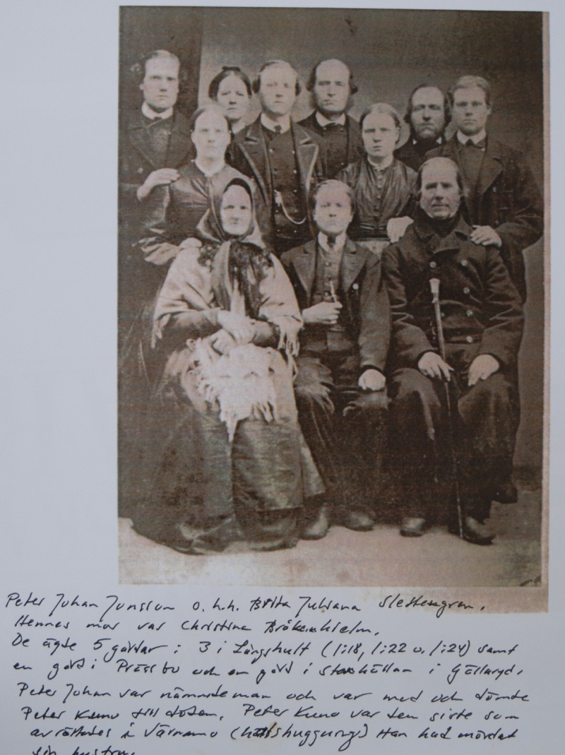 Peter Johan Jonsson o.h.h Britta Juliana Slettengren. Hennes mor var Christina Bråkenhielm. De ägde fem gårdar. 3 st i Långshult (1:18, 1:22 och 1:24) samt en gård i Prästbo och en i Stenskällan i Gällaryd. Peter Johan var nämndeman och var med och dömde Peter Kuno till döden. Peter Kuno var den siste avrättades i Värnamo( halshuggning). han hade mördat sin hustru. |