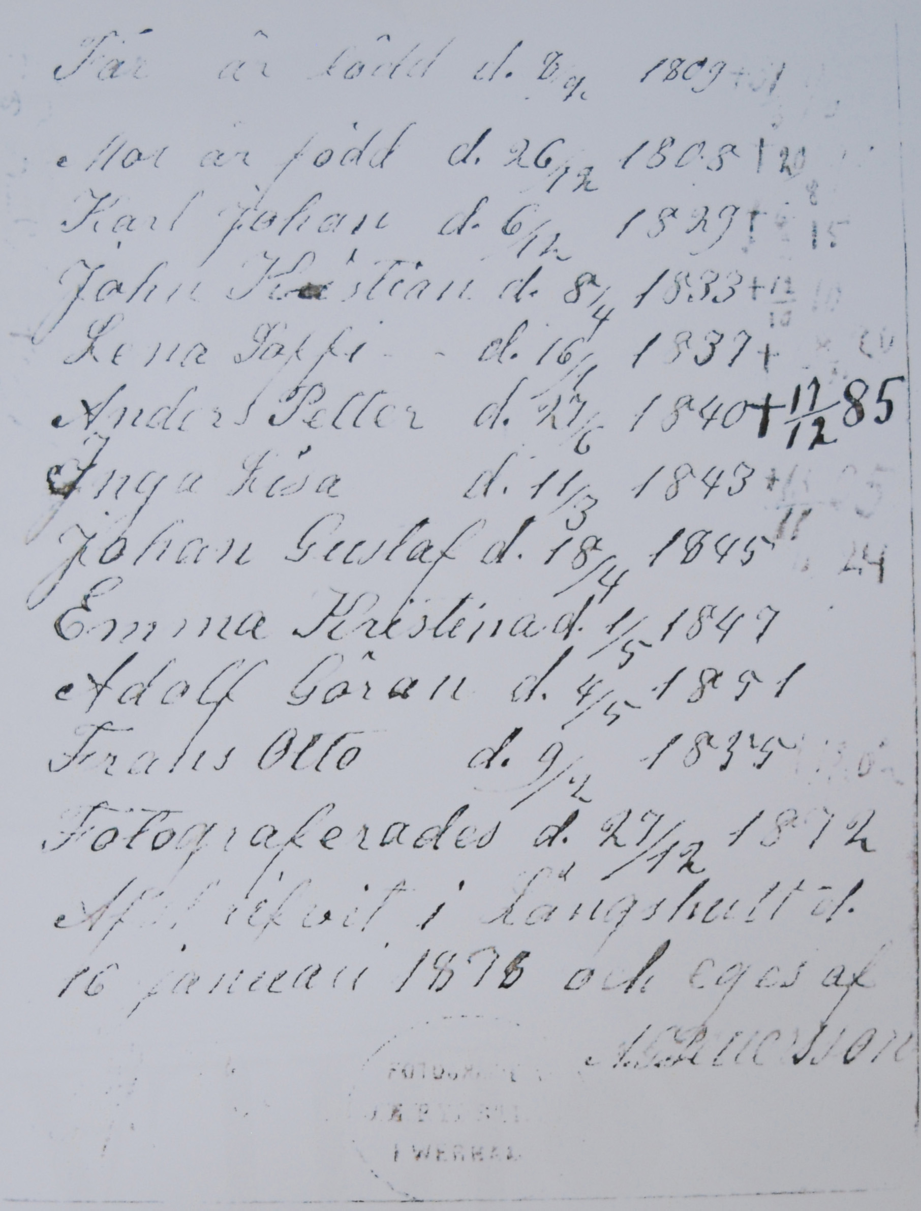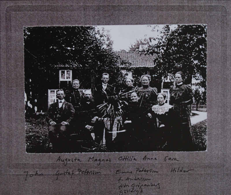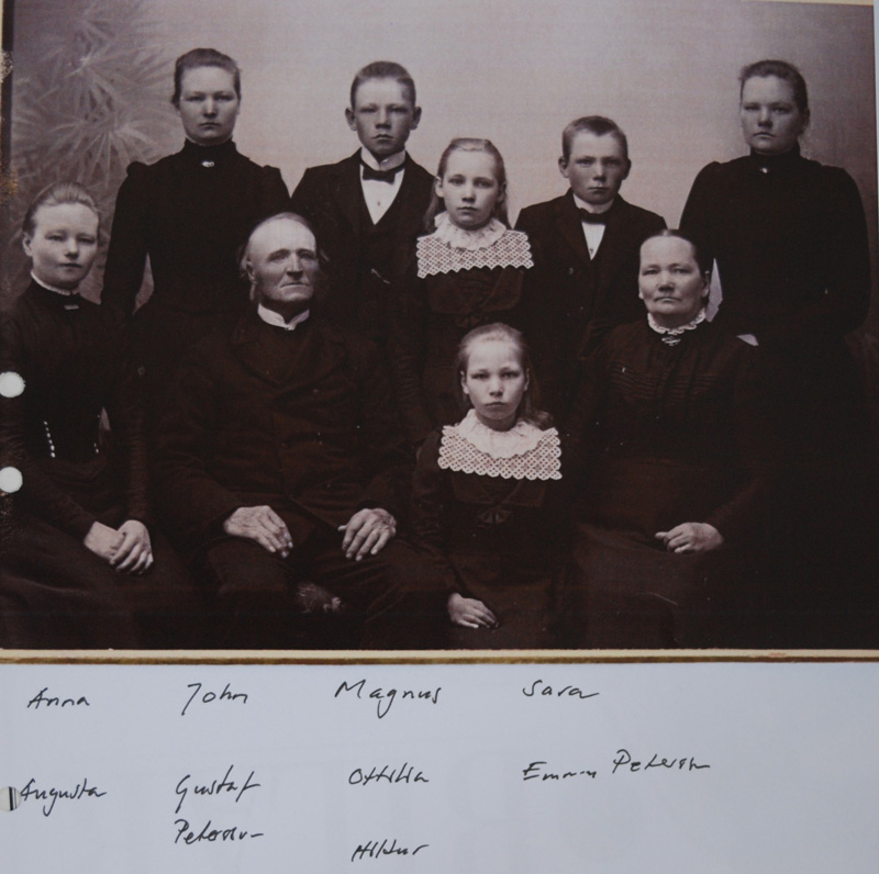 Stående: Anna, John, Ottilia,Magnus, Sara. Sittande: Augusta, Gustaf Petersson, Hildur, Emma Petersson. |
